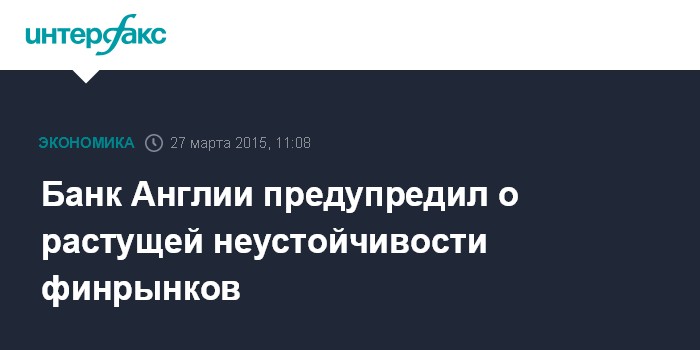 Москва. 27 марта. INTERFAX.RU – Руководство Банка Англии присоединилось к растущему числу регуляторов и инвесторов, предупреждающих, что глобальные финансовые рынки становятся все более "неустойчивыми" и склонными к чрезмерным колебаниям, пишет газета The Wall Street Journal.