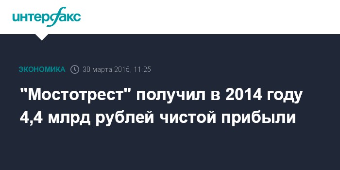 Москва. 30 марта. INTERFAX.RU – Чистая прибыль "Мостотреста" в 2014 году составила 4,416 млрд руб. против убытка в 1,43 млрд руб. годом ранее, говорится в отчетности компании.