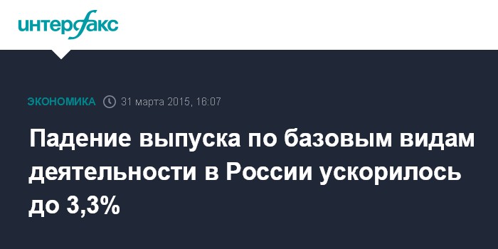 Москва. 31 марта. INTERFAX.RU – Выпуск продукции и услуг по базовым видам экономической деятельности в России в феврале 2015 года упал по сравнению с февралем 2014 года на 3,3% после снижения на 1,1% в январе, сообщил во вторник Росстат.