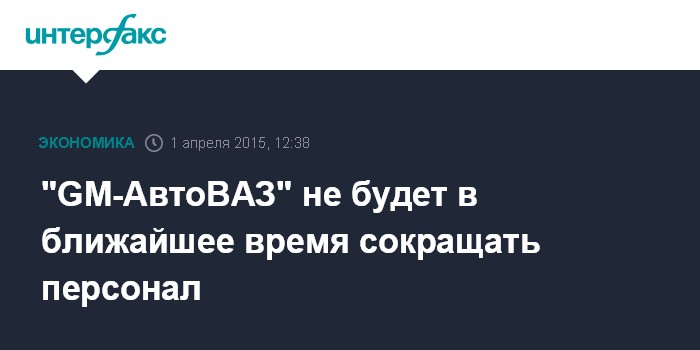Москва. 1 апреля. INTERFAX.RU – ЗАО "GM-АвтоВАЗ" (совместное производство General Motors и "АвтоВАЗа") не планирует в ближайшее время сокращать рабочие места, сообщили "Интерфаксу" в пресс-службе СП. Там уточнили, что массового приема новых сотрудников в условиях экономического спада также не ведется.