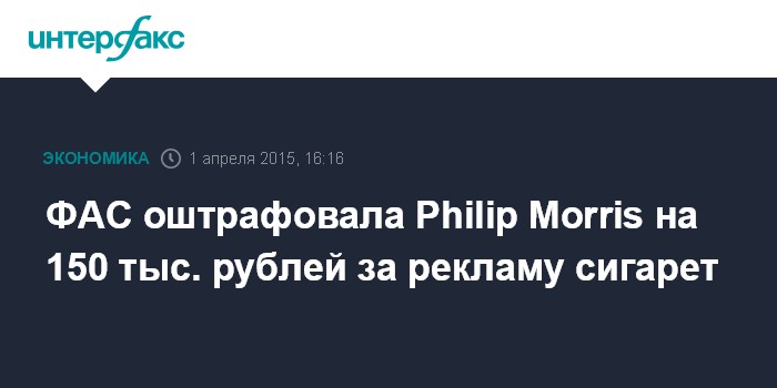 Москва. 1 апреля. INTERFAX.RU – Московское управление ФАС оштрафовало ООО "Филип Моррис Сэйлз энд Маркетинг" на 150 тыс. рублей за рекламу табачной продукции. Компания распространяла рекламу в форме sms-сообщения без согласия на получение рассылки от абонента, говорится в сообщении УФАС.