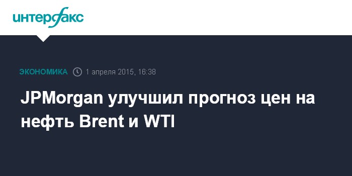 Москва. 1 апреля. INTERFAX.RU – Аналитики JPMorgan улучшили прогноз цен на нефть на 2015-2016 годы. Теперь они ожидают, что в текущем году марка Brent будет в среднем стоить $59 за баррель против прежней оценки в $49 за баррель, в следующем году - $62 за баррель против $57 за баррель, сообщило агентство Bloomberg.