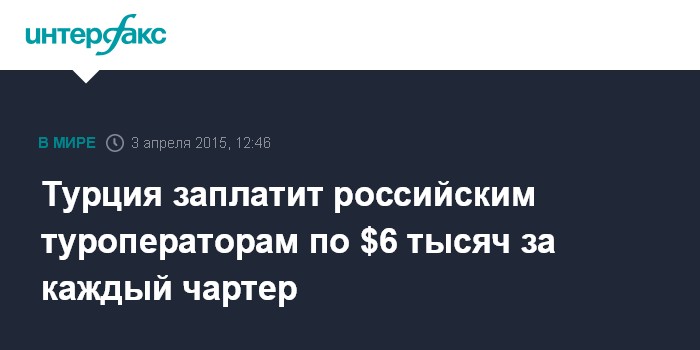 Москва. 3 апреля. INTERFAX.RU - Турецкие власти предоставят российским туроператорам субсидии в размере $6 тысяч за каждый чартерный рейс, который будет перевозить туристов из РФ на курорты страны. Об этом сообщили "Интерфаксу" в пятницу в посольстве Турции в России.