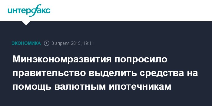 Москва. 3 апреля. INTERFAX.RU - Министерство экономического развития просит правительство РФ предусмотреть в антикризисном плане на 2015 год средства на помощь заемщикам по валютной ипотеке, сообщил "Интерфакс" источник в финансово-экономическом блоке правительства.