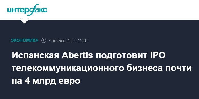 Москва. 7 апреля. INTERFAX.RU – Испанская инфраструктурная группа Abertis собирается выделить телекоммуникационный бизнес, недавно переименованный в Cellnex Telecom, в независимую компанию с последующим первичным размещением акций на бирже в Испании, пишет Financial Times.
