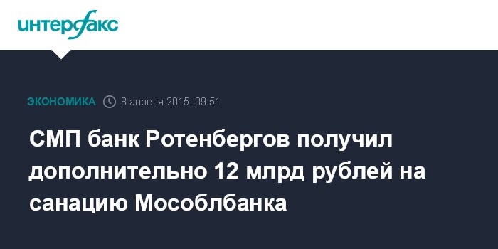 СМП банк Ротенбергов получил дополнительно 12 млрд рублей на санацию Мособлбанка