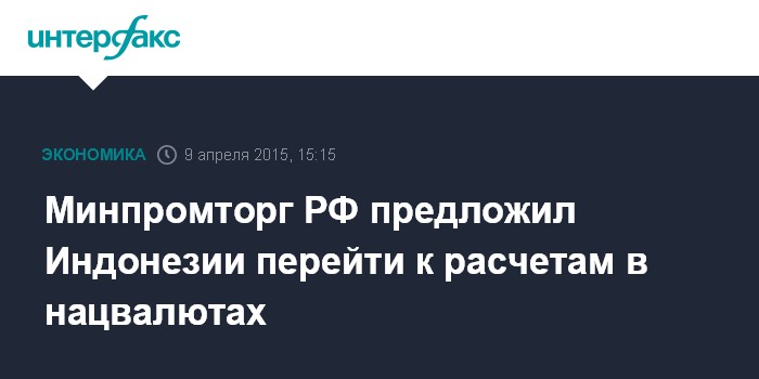 Москва. 9 апреля. INTERFAX.RU - Минпромторг РФ предлагает Индонезии перейти к расчетам в сфере торговых сделок в национальных валютах, сообщил глава ведомства Денис Мантуров на X заседании межправительственной Российско-Индонезийской совместной комиссии по торгово-экономическому и техническому сотрудничеству.