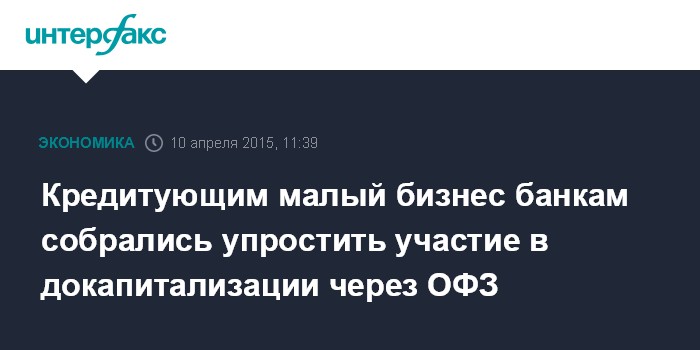 Москва. 10 апреля. INTERFAX.RU – Министерство экономического развития допускает снижение требований по уровню капитала банков, активно кредитующих малый и средний бизнес (МСБ), для их участия в программе докапитализации через механизм ОФЗ.