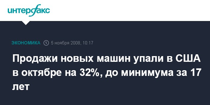 Москва. 5 ноября. INTERFAX.RU - Продажи новых автомашин в США упали в октябре до самого низкого с 1991 года уровня, снизившись на 32% по сравнению с тем же месяцем прошлого года, свидетельствуют данные исследовательской компании Autodata.