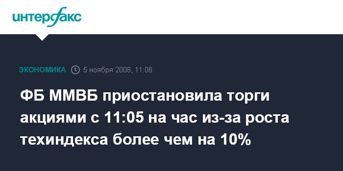Москва. 5 ноября. INTERFAX.RU - Фондовая биржа ММВБ в среду приостановила торги всеми акциями с 11:05 МСК на час из-за роста технического индекса биржи более чем на 10% к уровню закрытия предыдущего дня (1 ноября), сообщила биржа. К 11:00 мск технический индекс ММВБ вырос на 12,01% - до 1053,71 пункта.