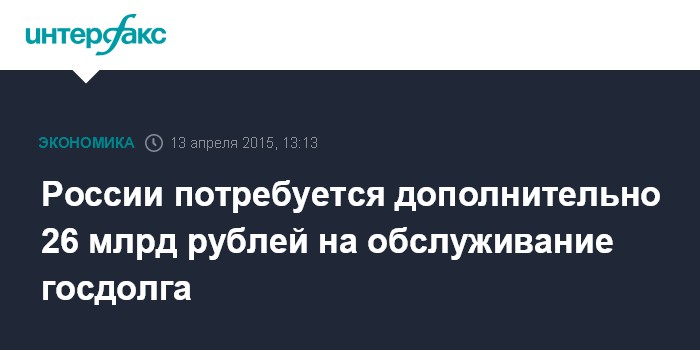Москва. 13 апреля. INTERFAX.RU – Минфин не исключает внесения поправок в бюджет 2015 года для увеличения на 26 млрд рублей средств на обслуживание государственного долга, сообщила журналистам первый замминистра финансов Татьяна Нестеренко.