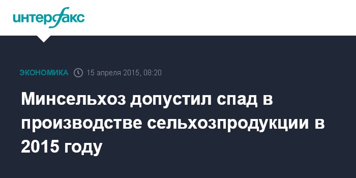 Москва. 15 апреля. INTERFAX.RU - Минсельхоз РФ в своих прогнозах на 2015 год не исключает не только замедление темпов роста сельхозпроизводства, но и его спад.