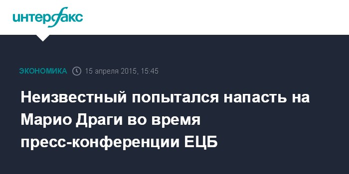 Москва. 15 апреля. INTERFAX.RU - Неизвестный осуществил попытку нападения на глав Европейского центрального банка Марио Драги, однако глава ЕЦБ не пострадал, и пресс-конференция возобновилась через несколько минут. Нападавший протестовал против "диктатуры ЕЦБ" в еврозоне.