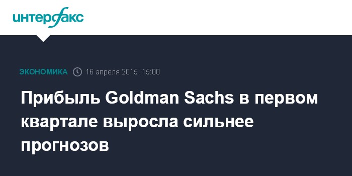 Москва. 16 апреля. INTERFAX.RU – Американский банк Goldman Sachs увеличил чистую прибыль в первом квартале 2015 года на 40% на фоне роста доходов от трейдинговых операций, сообщается в пресс-релизе банка.