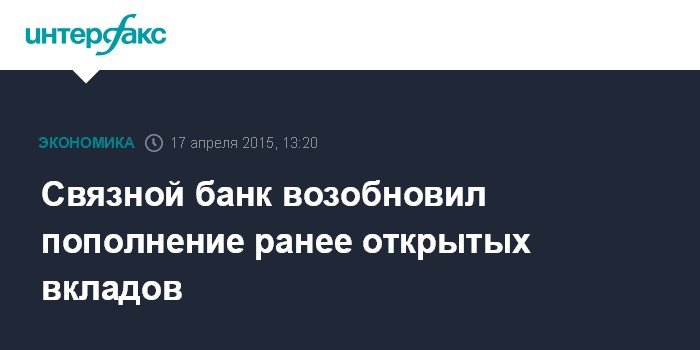 Москва. 17 апреля. INTERFAX.RU – Связной банк возобновил пополнение ранее открытых вкладов, говорится в сообщении банка.