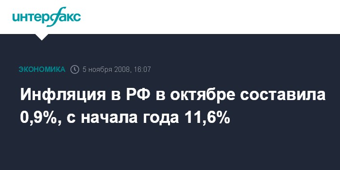 Москва. 5 ноября. INTERFAX.RU - Инфляция в РФ в октябре 2008 года составила 0,9% по сравнению с 1,6% в октябре 2007 года, сообщил "Интерфаксу" источник в одном из ведомств финансово-экономического блока со ссылкой на данные Росстата.