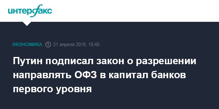 Москва. 21 апреля. INTERFAX.RU – Президент Владимир Путин в понедельник подписал закон, который позволяет Агентству по страхованию вкладов направлять облигации федерального займа в капитал первого уровня банков. Закон был принят Госдумой 10 апреля и одобрен Советом Федерации 15 апреля 2015 года.