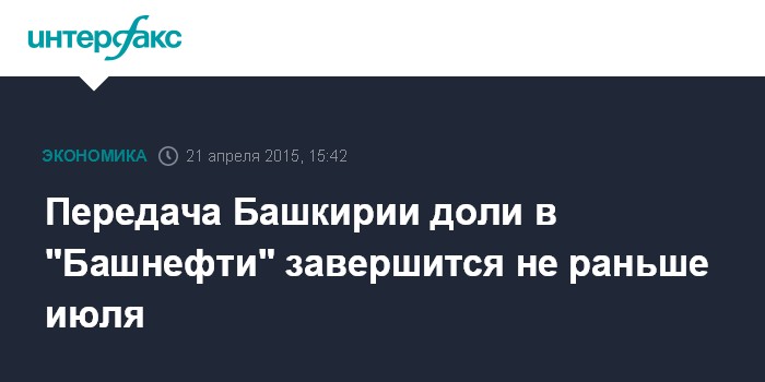 Москва. 21 апреля. INTERFAX.RU – Процесс передачи республике Башкирия доли акций в "Башнефти" будет завершен не раньше июля, сообщили "Интерфаксу" ряд источников, знакомых с ситуацией.