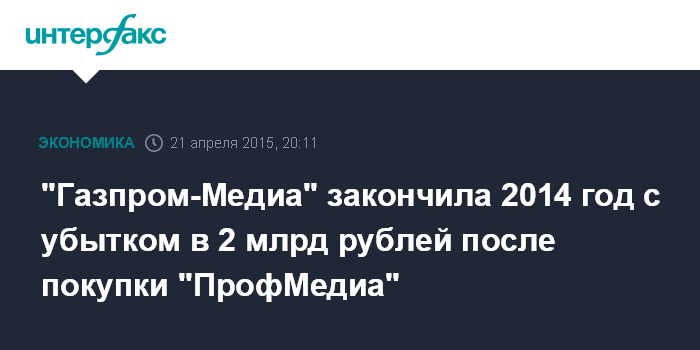 Москва. 21 апреля. INTERFAX.RU - "Газпром-Медиа холдинг" получил убыток в 2014 году после приобретения холдинга "ПрофМедиа".
