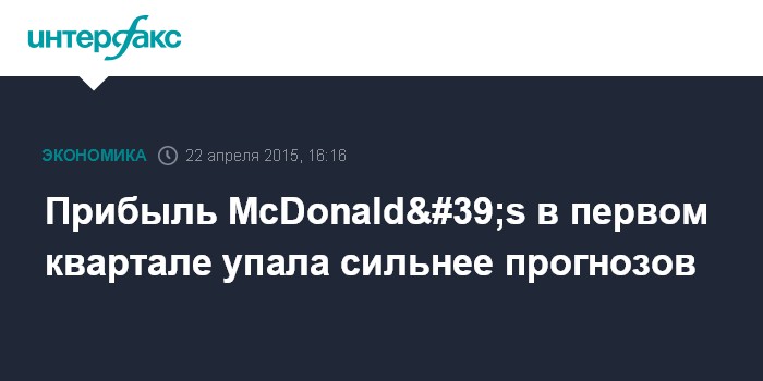 Москва. 22 апреля. INTERFAX.RU – Чистая прибыль крупнейшей в мире сети ресторанов быстрого обслуживания McDonald's по итогам первого квартала 2015 года упала на 33% на фоне негативного влияния колебаний валютных курсов.