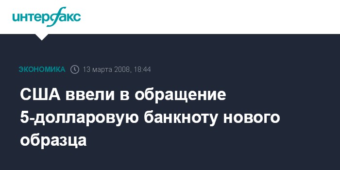 Москва. 13 марта. INTERFAX.RU - Первая 5-долларовая банкнота нового образца была выпущена в четверг в обращение Федеральной резервной системой (ФРС) США, американские банки начинают получать новые купюры, чтобы выдавать их предприятиям и потребителям, сообщается в пресс-релизе МВД США.