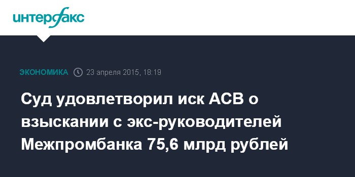 Москва. 23 апреля. INTERFAX.RU - Арбитражный суд Москвы в четверг удовлетворил иск Агентства по страхованию вкладов (АСВ) о привлечении к субсидиарной ответственности четырех бывших руководителей Межпромбанка (МПБ) в объеме 75,6 млрд рублей.