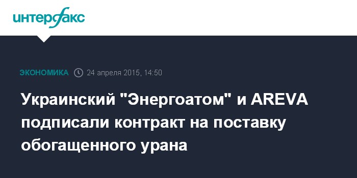 Москва. 24 апреля. INTERFAX.RU - Украинская НАЭК "Энергоатом" и французская AREVA в пятницу в Брюсселе подписали контракт на поставку обогащенного урана, говорится в сообщении украинской компании.