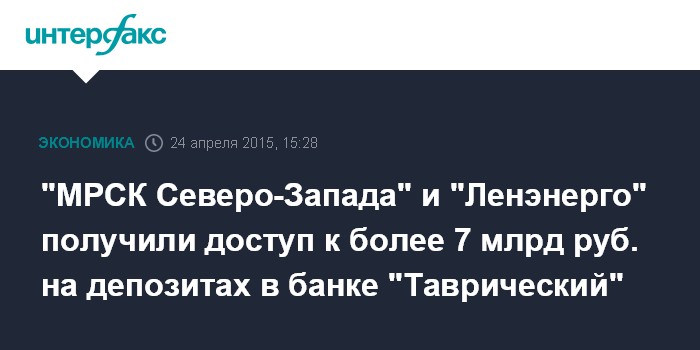 Москва. 24 апреля. INTERFAX.RU – "Ленэнерго" и "МРСК Северо-Запада", подконтрольные государственному электросетевому холдингу "Россети", получили доступ к собственным средствам на депозитах в банке "Таврический" в объеме более 7 млрд руб., сообщили "Интерфаксу" в "Россетях".