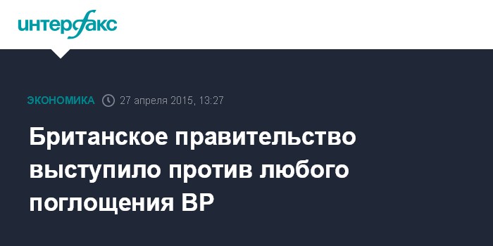 Москва. 27 апреля. INTERFAX.RU – Правительство Великобритании официально объявило о своем отрицательном отношении к любым попыткам поглощения нефтегазового концерна BP Plc, который существенно сдал позиции из-за огромных расходов на выплату компенсаций в связи с разливом нефти в Мексиканском заливе в 2010 году, пишет Financial Times.