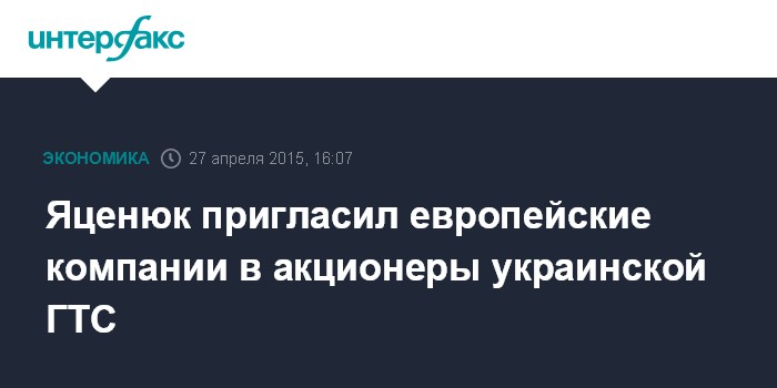 Москва. 27 апреля. INTERFAX.RU – Украина призывает компании из стран ЕС стать акционерами украинской газотранспортной системы, чтобы повысить энергетическую независимость в Европе, заявил премьер-министр Арсений Яценюк.