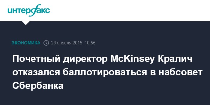 Почетный директор McKinsey Кралич отказался баллотироваться в набсовет Сбербанка