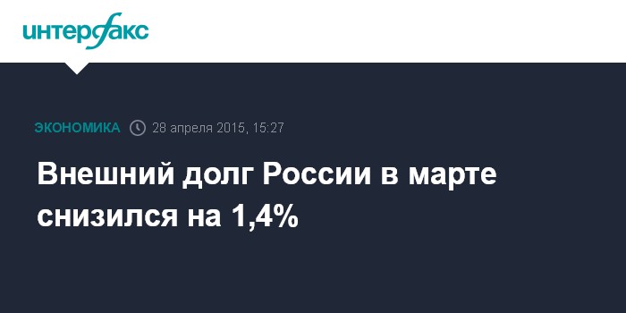 Москва. 28 апреля. INTERFAX.RU – Государственный внешний долг России в марте 2015 года снизился на $0,787 млрд, или на 1,4%, до $53,481 млрд, свидетельствуют данные Минфина.
