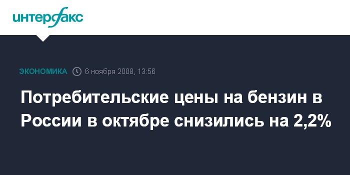 Москва. 6 ноября. INTERFAX.RU - Потребительские цены на автомобильный бензин в России в октябре 2008 г. снизились на 2,2% после снижения на 1,5% в сентябре, сообщила в четверг Федеральная служба государственной статистики.