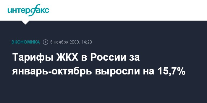 Москва. 6 ноября. INTERFAX.RU - Тарифы на жилищно-коммунальные услуги в России за январь-октябрь 2008 г. выросли на 15,7%, сообщила Федеральная служба государственной статистики (Росстат) в четверг. В октябре повышение тарифов на услуги ЖКХ составило 0,2% при 0,2% в сентябре и 0,4% в августе.