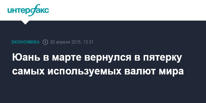 Москва. 30 апреля. INTERFAX.RU – Китайский юань в марте 2015 года поднялся с седьмого на пятое место среди мировых валют, наиболее часто используемых в международных расчетах, свидетельствуют данные расчетной системы SWIFT.