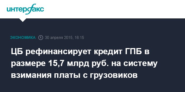 ЦБ рефинансирует кредит ГПБ в размере 15,7 млрд руб. на систему взимания платы с грузовиков