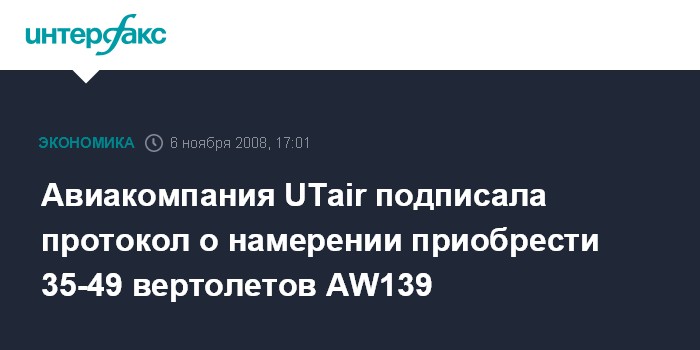 Москва. 6 ноября. INTERFAX.RU - ОАО "Авиакомпания UTair" подписало протокол о намерении приобрести от 35 до 49 вертолетов AW139, которые будут произведены на СП корпорации "Оборонпром" и итальянской AgustaWestland, говорится в сообщении "Оборонпрома".
