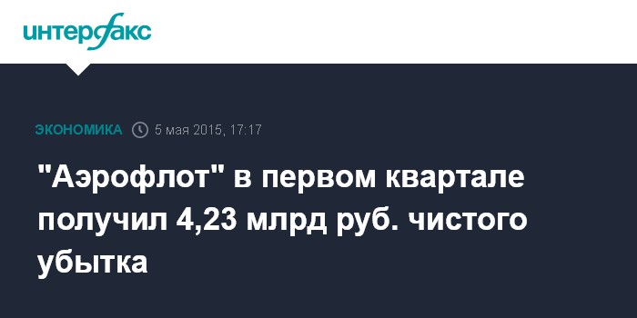 Москва. 5 мая. INTERFAX.RU – Чистый убыток "Аэрофлота" по РСБУ по итогам первого квартала 2014 года составил 4,23 млрд руб. против прибыли в размере 3,092 млрд руб. годом ранее, сообщает компания.