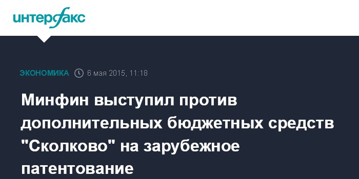 Москва. 6 мая. INTERFAX.RU – Минфин выступает против выделения дополнительных бюджетных средств "Сколково" на оказание услуг по зарубежному патентованию для лиц, не являющихся участниками проекта. Об этом "Интерфаксу" сообщил источник, знакомый с ответом ведомства на соответствующий запрос Минэкономразвития.