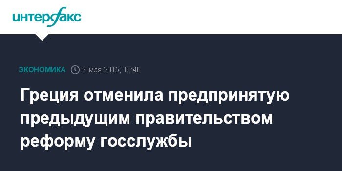 Москва. 6 мая. INTERFAX.RU – Греческий парламент в четверг принял закон, отменяющий реформу государственной службы, предпринятую предыдущим правительством с целью сокращения штата госслужащих, сообщает Financial Times.