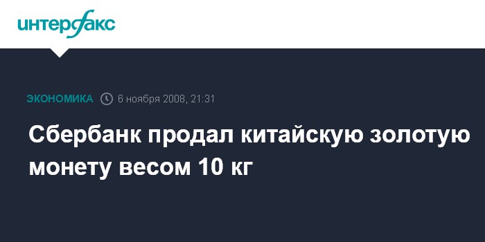 Москва. 6 ноября. NTERFAX.RU - Сбербанк России продал золотую монету массой 10 килограммов, изготовленную Народным банком Китая, которая стала самой большой золотой монетой, проданной в России, говорится в сообщении Сбербанка.
