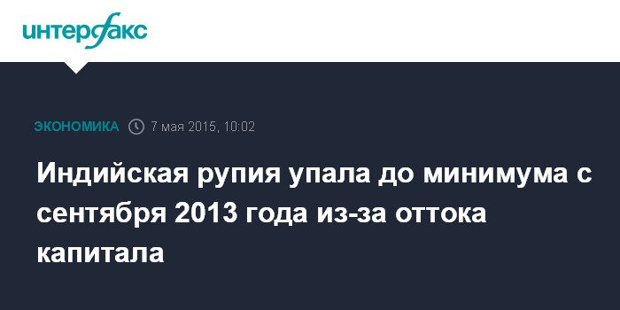 Москва. 7 мая. INTERFAX.RU – Курс индийской рупии к доллару США упал в ходе торгов в четверг до минимума с сентября 2013 года, поскольку иностранные фонды сократили вложения в индийские активы, выводя капитал из страны, сообщает агентство Bloomberg.