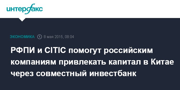Москва. 8 мая. INTERFAX.RU – Российский фонд прямых инвестиций и китайская компания CITIC Merchant, подразделение финансовой группы CITIC, договорились о создании российско-китайского инвестиционного банка. Соответствующее соглашение будет подписано в рамках визита председателя КНР Си Цзиньпина в Россию 8 мая, сообщили в РФПИ.