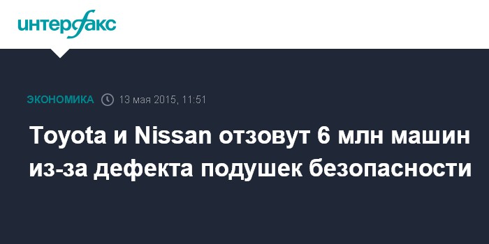 Москва. 13 мая. INTERFAX.RU - Японские автопроизводители Toyota Motor Corp. и Nissan Motor Co. в среду объявили об отзыве в общей сложности 6,56 млн автомобилей по всему миру в связи с возможными дефектами подушек безопасности, производимых Takata Corp., пишет газета The Wall Street Journal.
