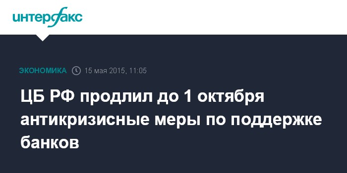 Москва. 15 мая. INTERFAX.RU - Центробанк РФ по итогам обсуждения с банковским сообществом продлил до 1 октября ряд мер по поддержке банковского сектора, которые были введены в декабре 2014 года на фоне девальвация рубля и повышенной волатильность на финансовом рынке.