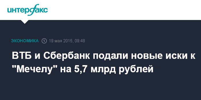 Москва. 19 мая. INTERFAX.RU - ВТБ и Сбербанк подали в Арбитражный суд Москвы иски о взыскании с компаний группы "Мечел" в общей сложности 5,665 млрд рублей, следует из материалов суда.