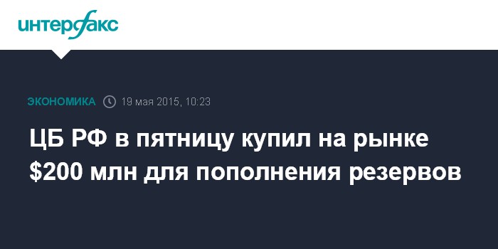 Москва. 19 мая. INTERFAX.RU - ЦБ РФ в пятницу, 15 мая, купил на рынке $200 млн для пополнения международных резервов, свидетельствует информация на сайте регулятора.