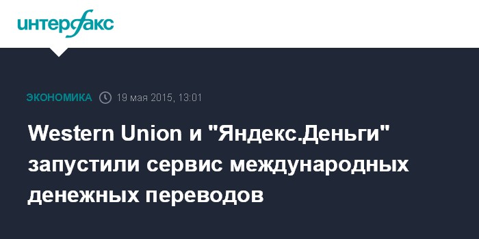 Москва. 19 мая. INTERFAX.RU - Платежные системы Western Union и "Яндекс.Деньги" запускают совместный сервис международных денежных переводов, сообщили агентству "Интерфакс" в пресс-службе российской компании.