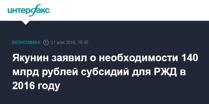 Москва. 21 мая. INTERFAX.RU – ОАО "Российские железные дороги" в 2016 году потребуется 140 млрд рублей субсидий - причем их объем будет одинаковым и при росте грузового тарифа на 7,5%, и при его увеличении на 10%, заявил президент компании Владимир Якунин журналистам в четверг.