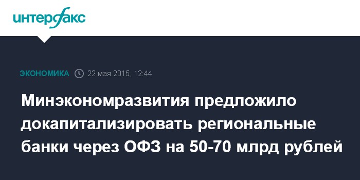 Москва. 22 мая. INTERFAX.RU - Минэкономразвития предлагает докапитализировать региональные банки через облигации федерального займа (ОФЗ) на 50-70 млрд рублей, сообщил "Интерфаксу" источник в финансово-экономическом блоке правительства.